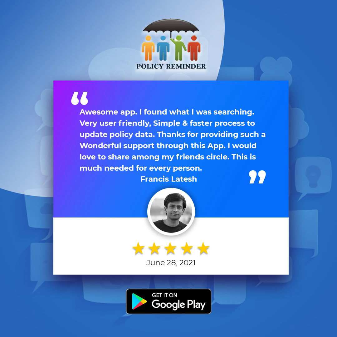 Many Features like listing policies which we wish to view & track, import/export via excel , backup policy data to your own google drive to assure 100% secure & private.